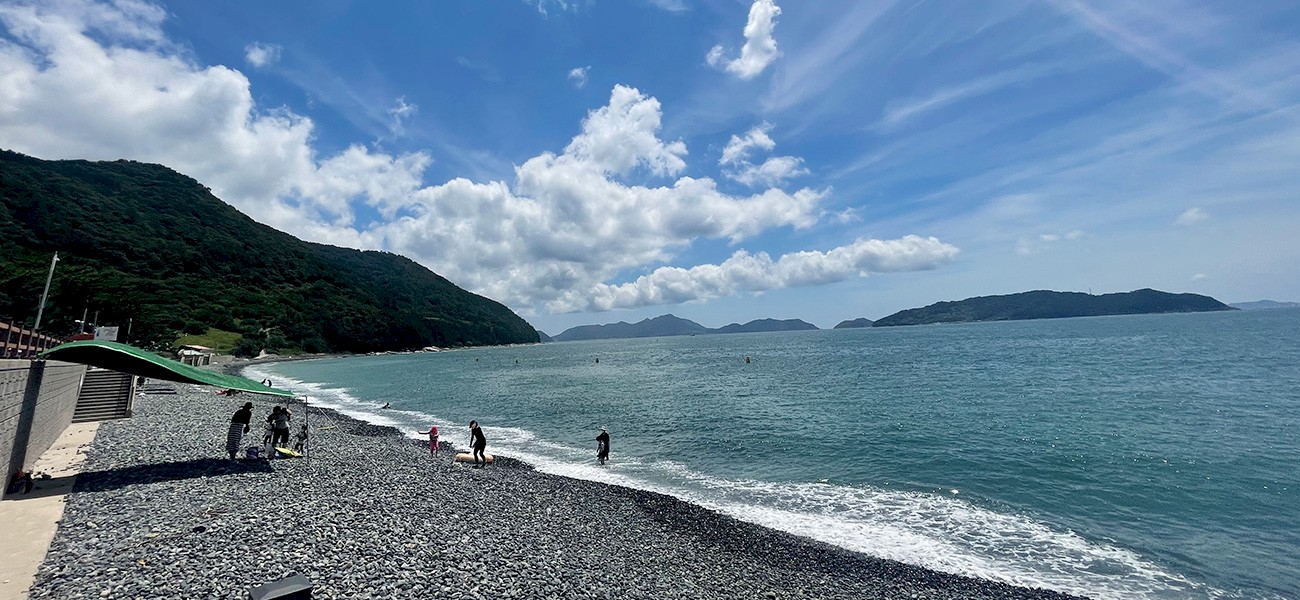 몽돌해수욕장에 그늘막을 설치해 두었습니다. 몽돌 해변의 시원한 그늘 아래에서 바닷바람을 맞으며 즐거운 휴가를 보내세요.